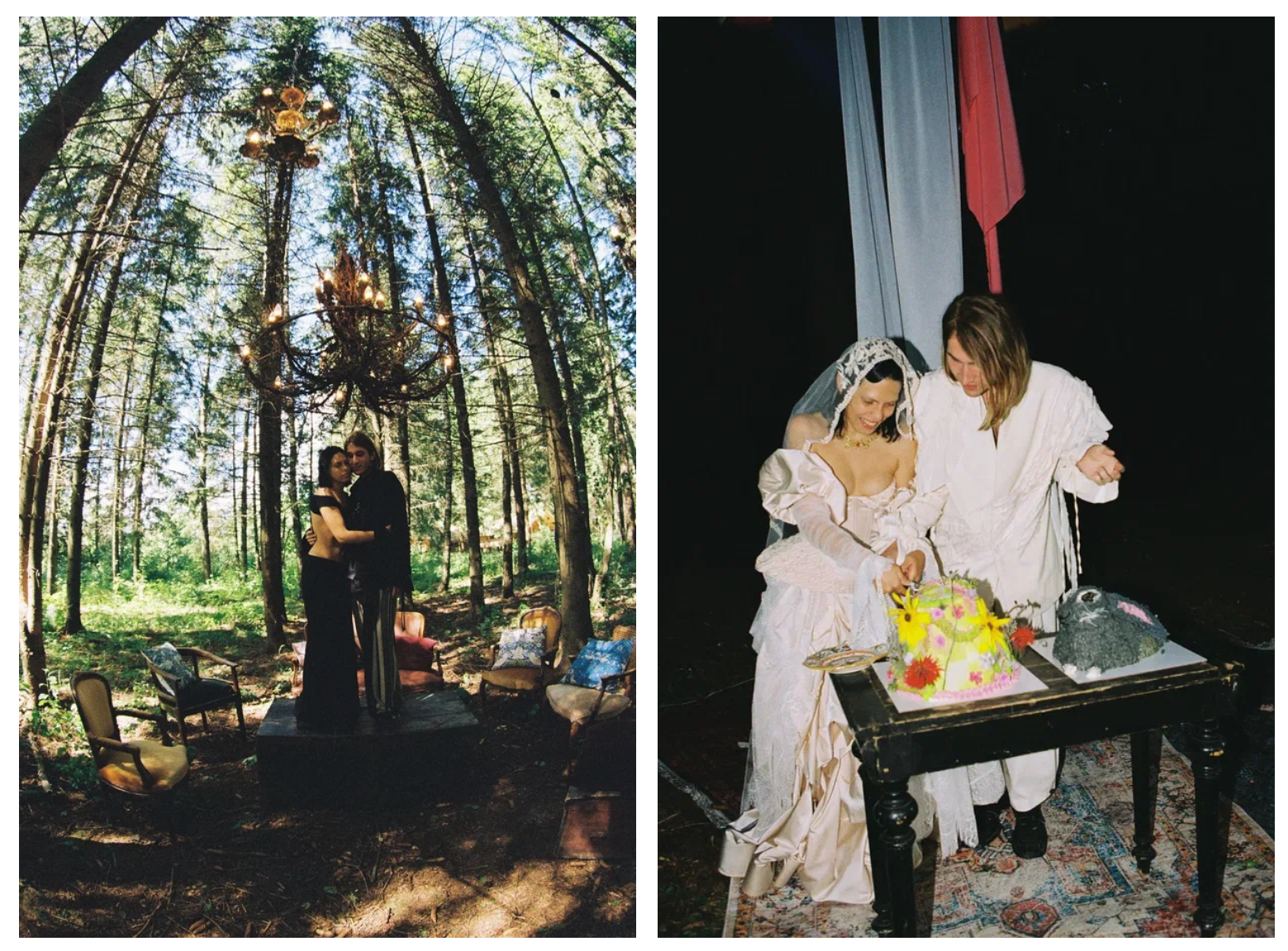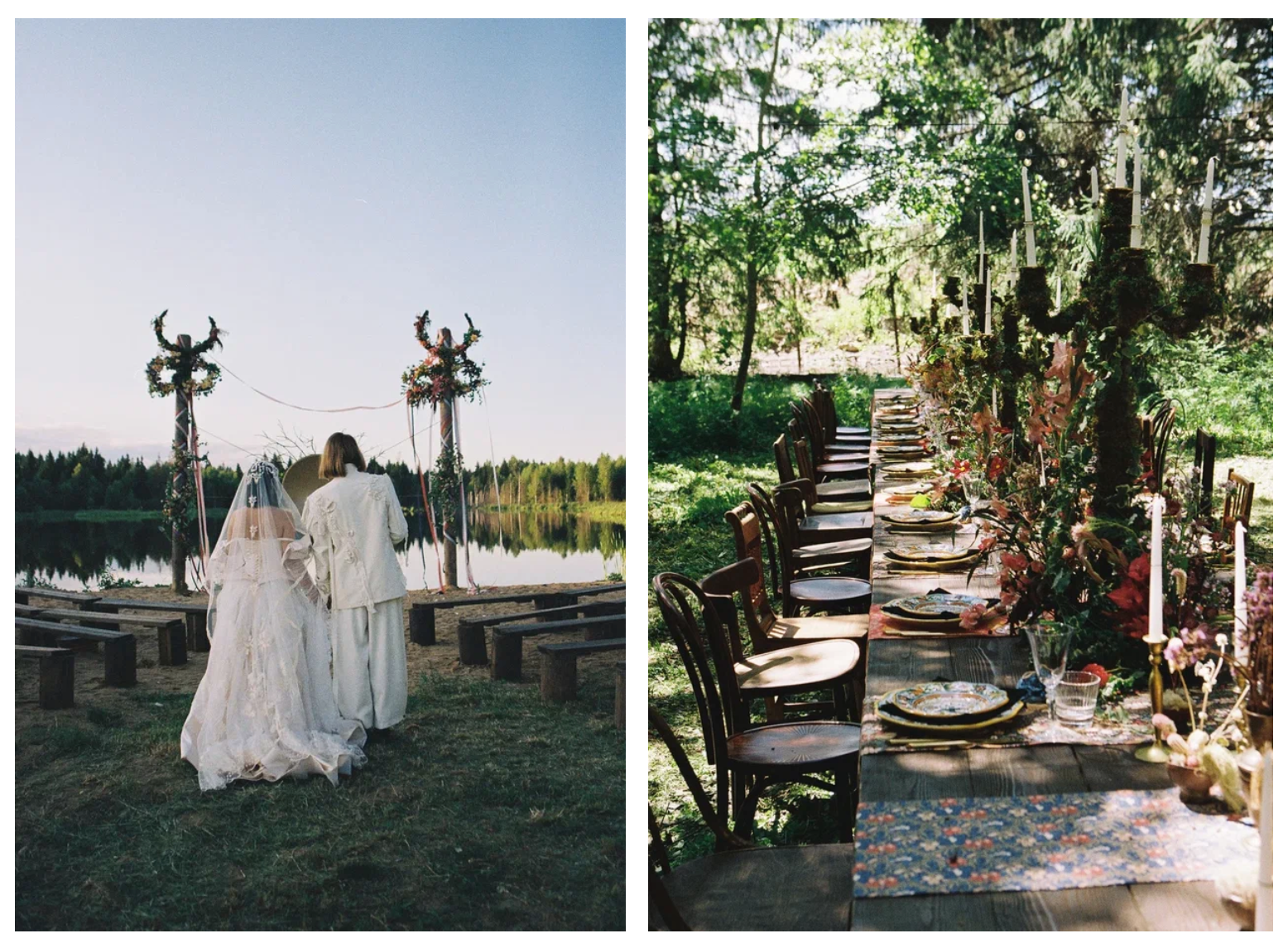 На свадьбе Эрнеста и Лены они сделали дикий микс из рустика (обилие дерева, природных элементов), винтажа (латунные подсвечники и вазы с блошиного рынка, старинные стулья), фэшн мотивов (ткани, принты) и еще мистики, волшебства и сказок (инсталляция в зоне церемонии).Всё вышеописанное смешалось не просто так, а потому что отражало саму пару. Ребята простые, обожают русскую природу, но вместе с этим учились в Европе, свободное время любят проводить на барахолках, а невеста недавно запустила свой бренд одежды. Какой ещё должны была быть их свадьба?